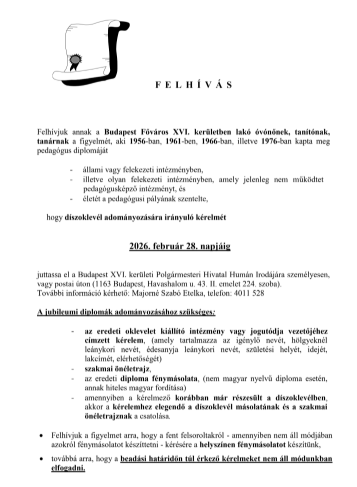 FELHÍVÁS Szeretettel hívjuk fel a Budapest Főváros XVI. kerületében…